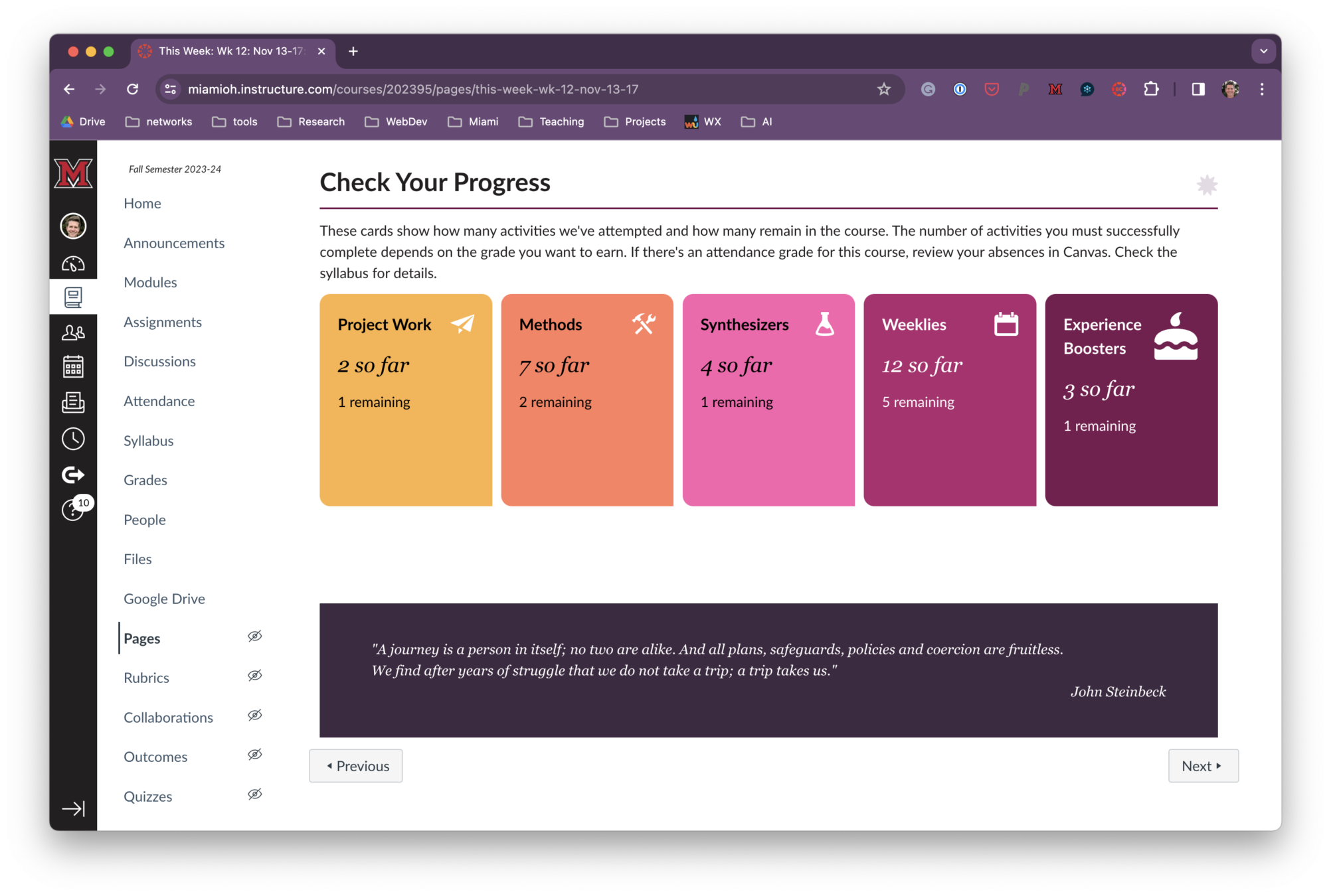 Just like when playing a board game, it helps to know how far you’ve come during the semester and how much is left. I create a “This Week” page in Canvas every week of the semester with reminders on how many assignments are left in each bundle. It took some work to create, but it’s set for the next time I teach the class.