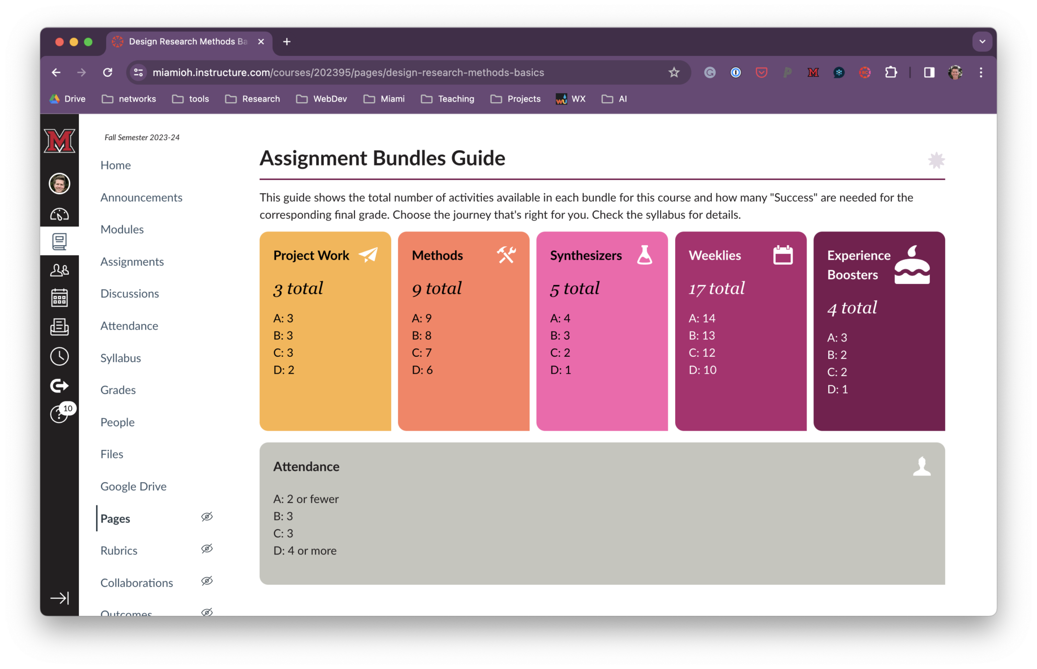 I created a colorful bundle visualization in an easy-to-find “Course Reference” module in Canvas so students could access the information quickly. One student shared that they liked how it was a “syllabus lite” page that had all of the crucial information in one place. I found myself referring to it often.