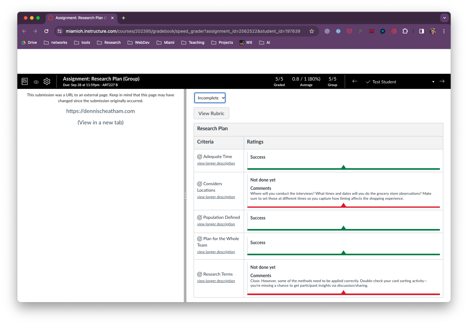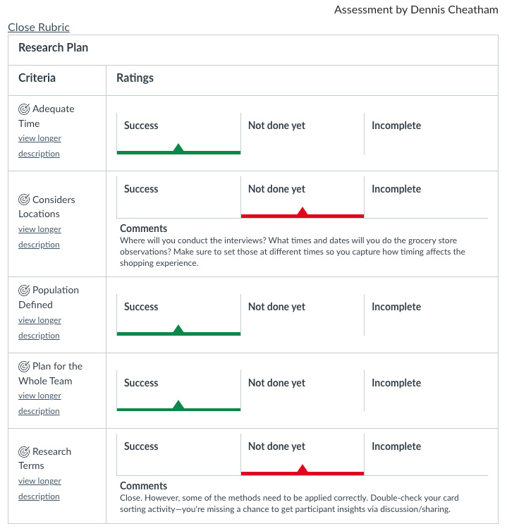 This rubric shows an example of my feedback for a hypothetical student. I chose “Success, Not Done Yet, Incomplete” as my accomplishment levels.