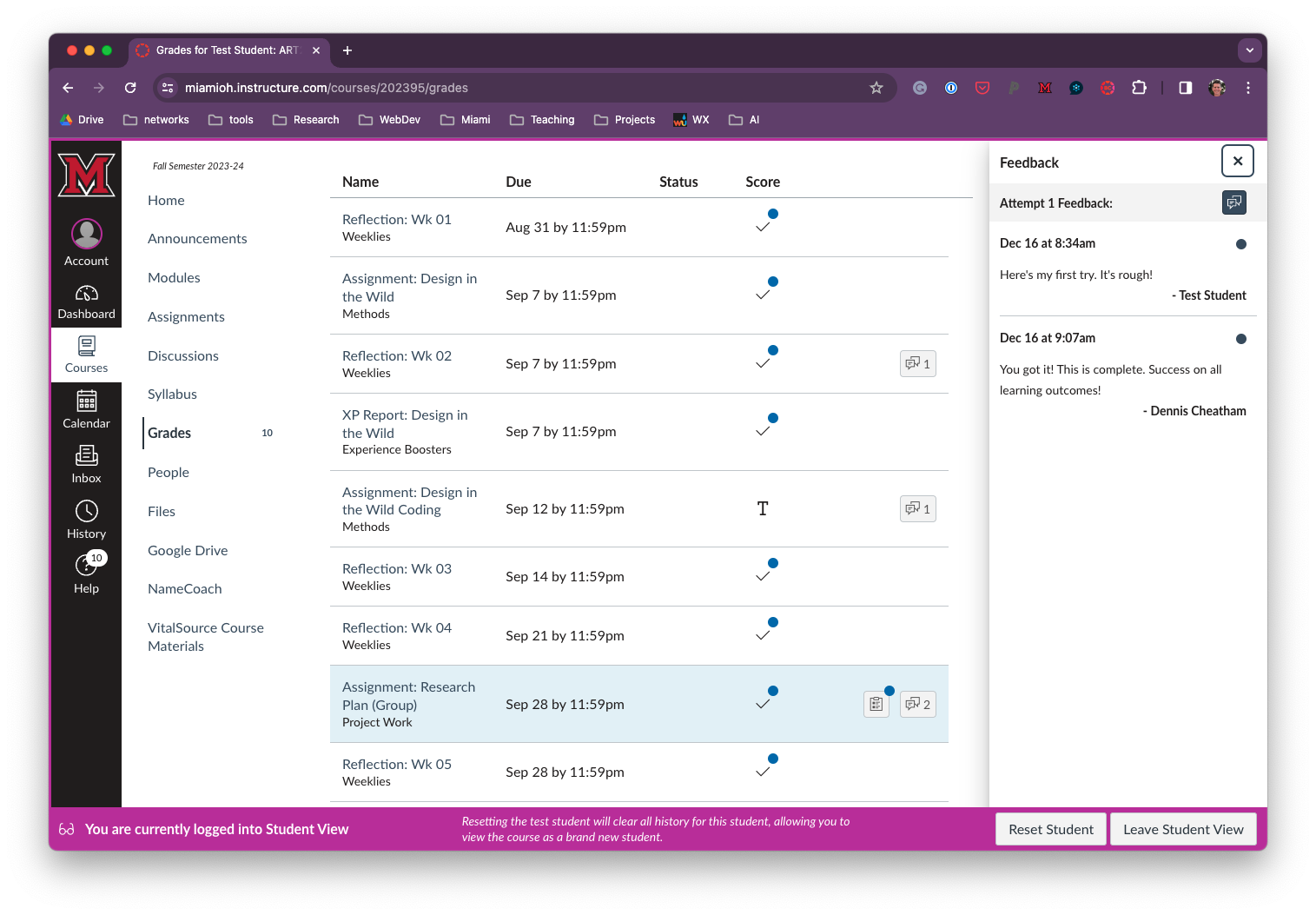 Students receive blue circle alerts in the Grades tab in Canvas when instructors post comments and update the rubric with feedback.